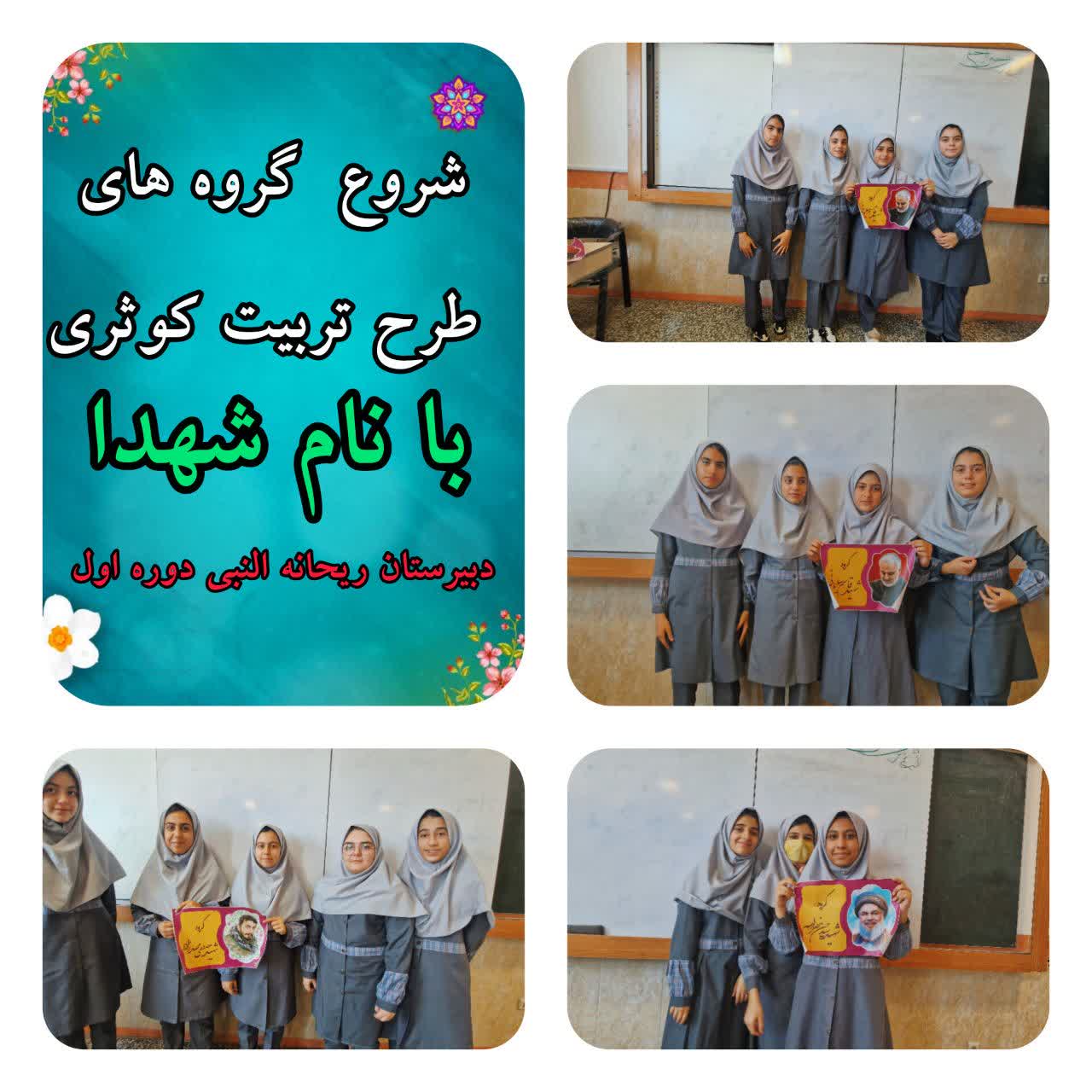 دبیرستان ریحانه النبی (س)دوره اول شروع به آغاز اجرای طرح تربیت کوثری مدارس الگوی صالح که طرحی ویژه بر اساس سند تحول بنیادین میباشد نموده است. طرحی که مدیریت محترم دوره اول بر انجام هرچه بهتر آن در دبیرستان ریحانه النبی دوره اول بمنظور رشد و تعالی دانش آموزان در ابعاد رفتاری و اخلاقی وهمچنین استفاده از استعداد ها ومهارت های دانش آموزان درزمینه های مختلف دارند. بدین منظور دانش آموزان پس از آگاهی از روند اجرای طرح توسط مربیان مربوطه در کلاس به گروه هایی تقسیم شدند که هر کدام از این گروه ها با نام یک شهید مزین گردید….