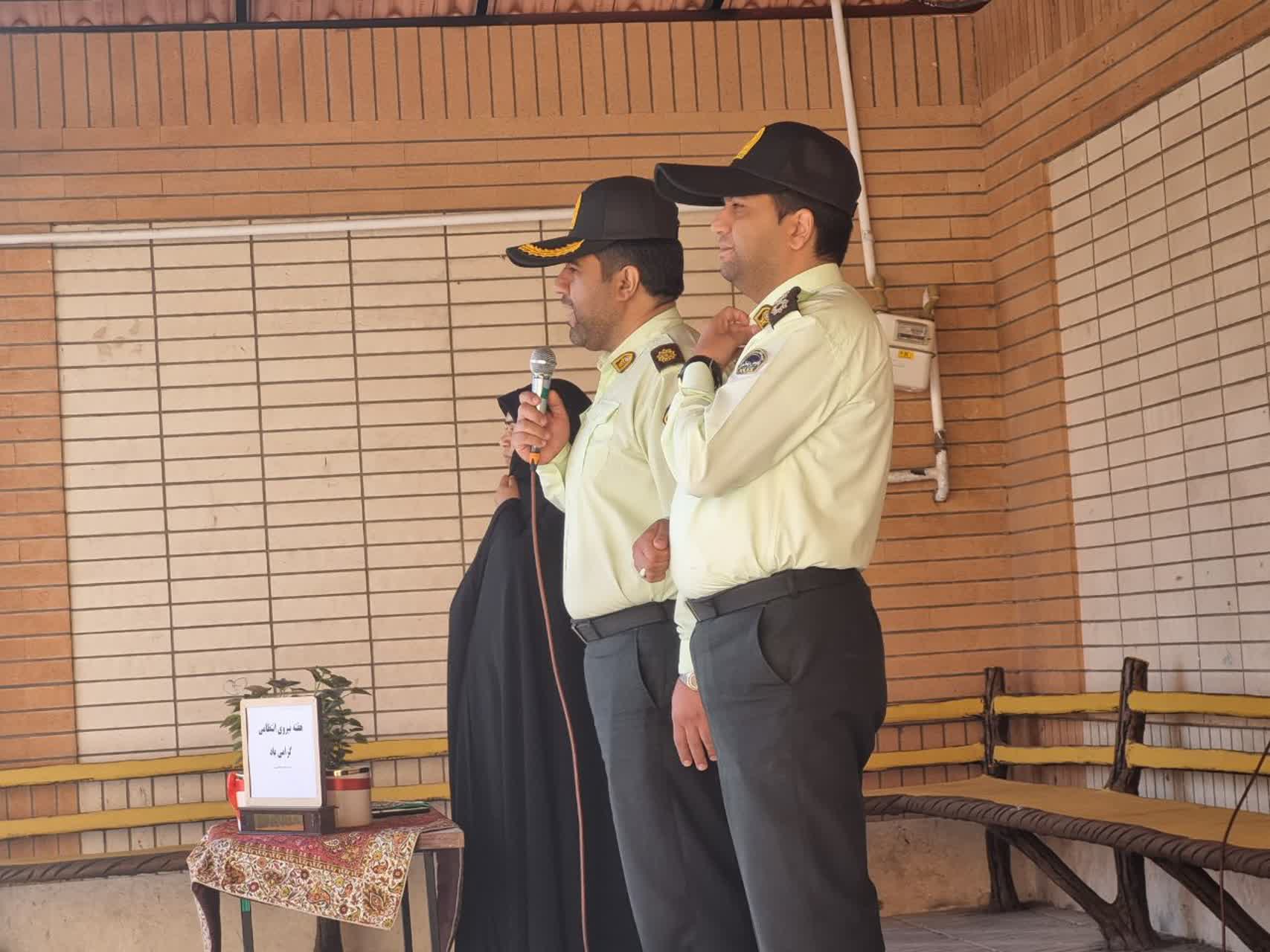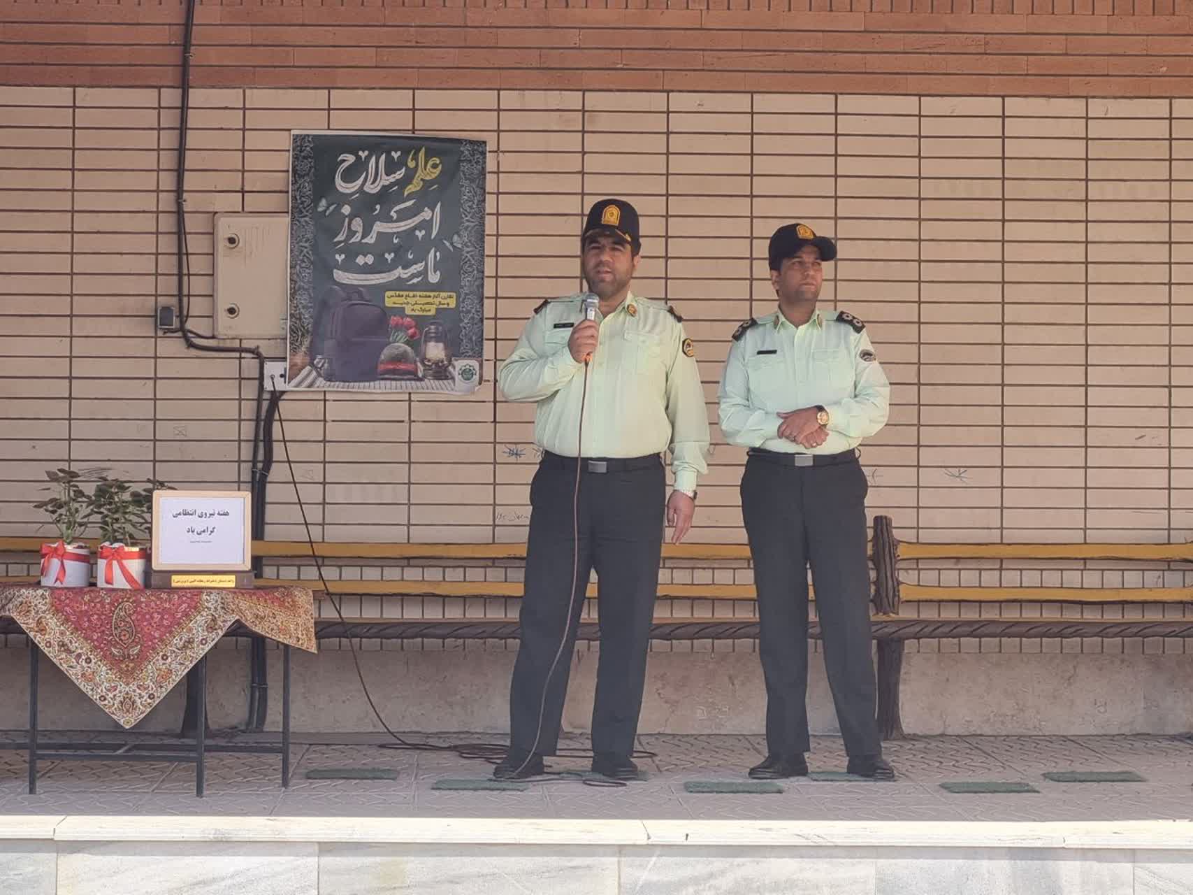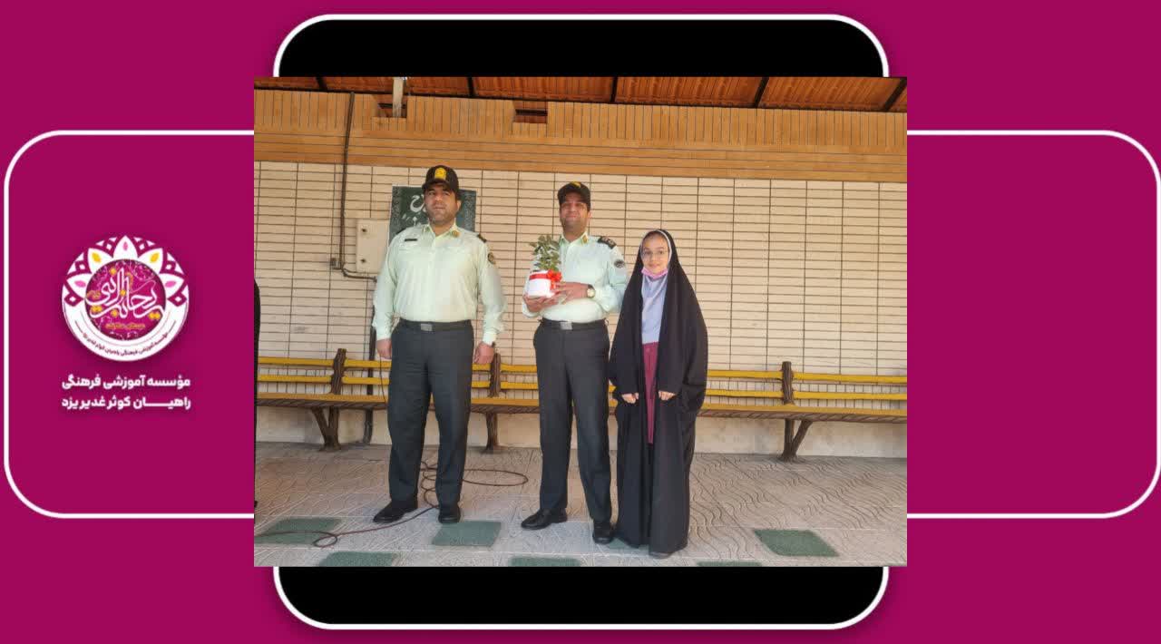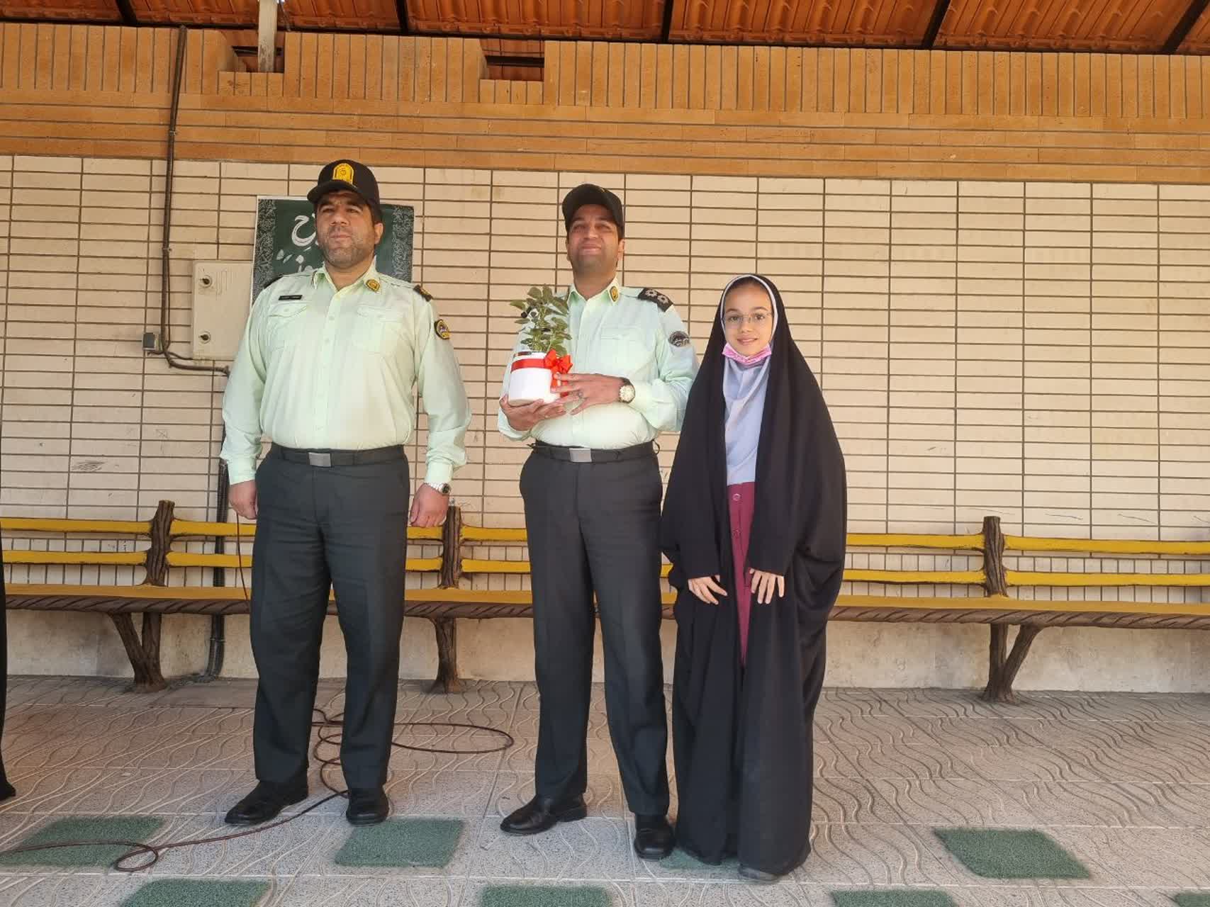 در اولین روز از هفته نیروی انتظامی ودر مراسم صبحگاه مدرسه ،رسته های فرماندهی نیروی انتظامی جمهوری اسلامی ایران معرفی گردید و در همین راستا از جناب سرگرد انتظاری وجناب سروان عسگری( پدر دانش آموز پایه ششم) دعوت بعمل آمد تا در مورد وظایف حوزه های کاری خود در پلیس راه آهن توضیحاتی برای دانش آموزان ارائه نمودند. و در پایان سرکار خانم هادوی مدیریت محترم دبستان با اهدای یک گلدان گل از طرف تمامی دانش آموزان از این عزیزان تشکر نمودند.