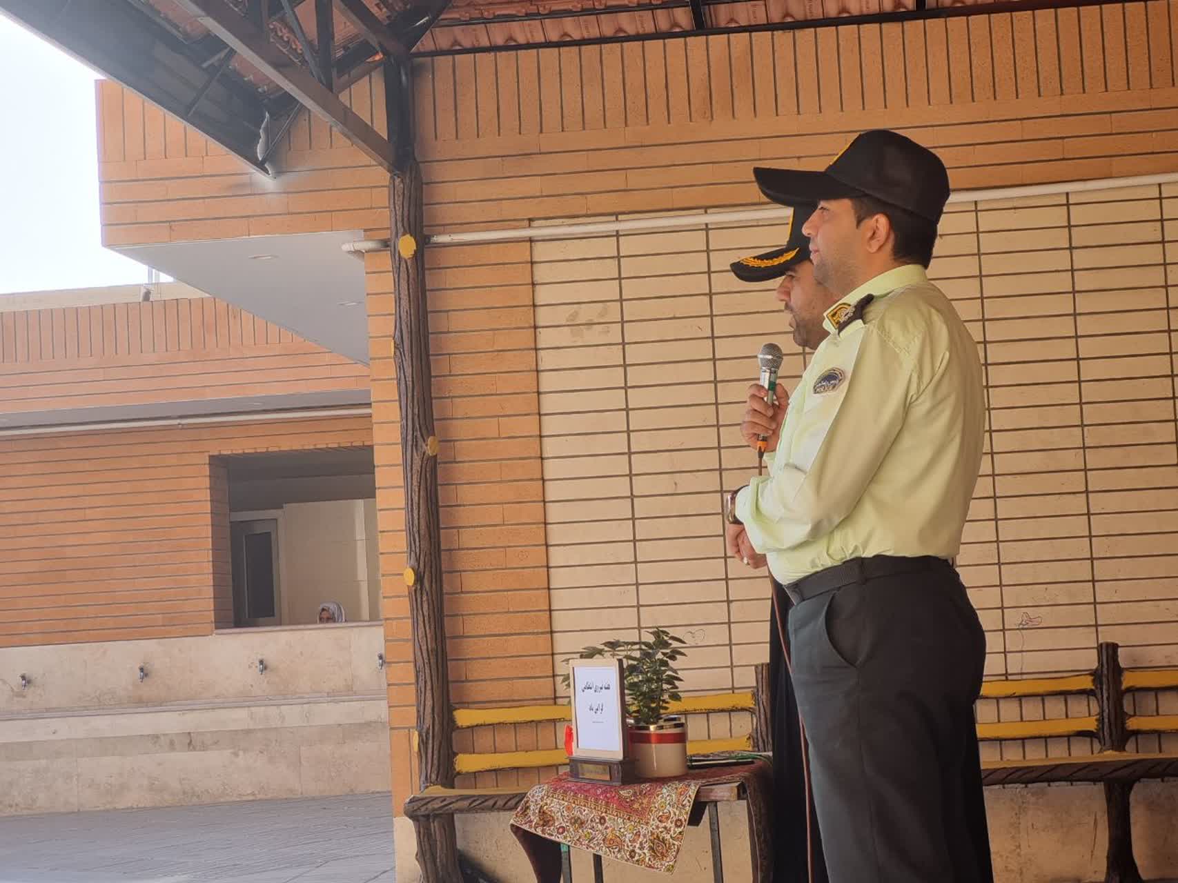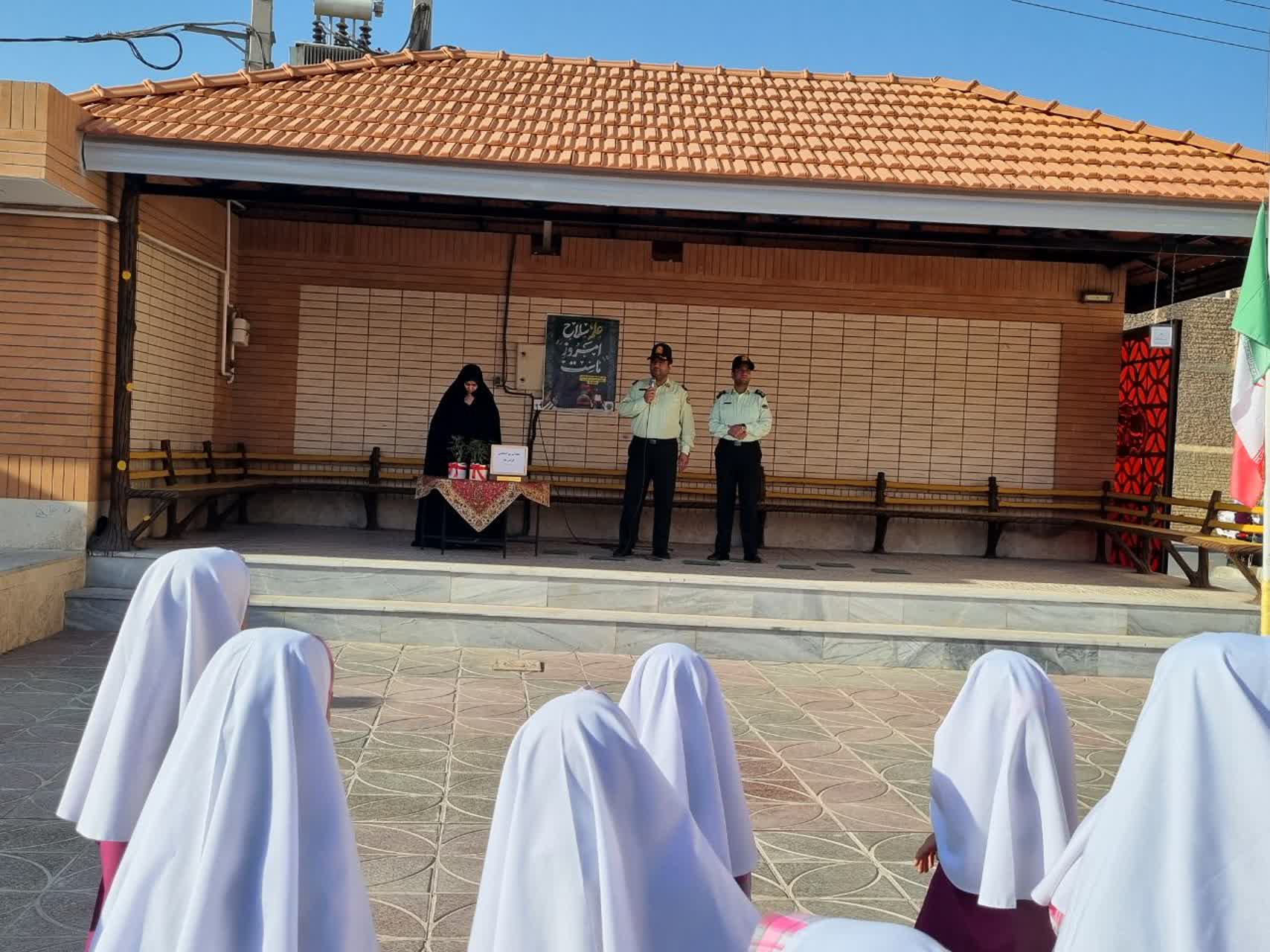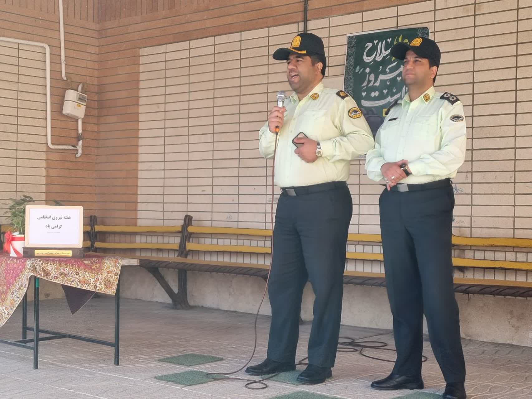 در اولین روز از هفته نیروی انتظامی ودر مراسم صبحگاه مدرسه ،رسته های فرماندهی نیروی انتظامی جمهوری اسلامی ایران معرفی گردید و در همین راستا از جناب سرگرد انتظاری وجناب سروان عسگری( پدر دانش آموز پایه ششم) دعوت بعمل آمد تا در مورد وظایف حوزه های کاری خود در پلیس راه آهن توضیحاتی برای دانش آموزان ارائه نمودند. و در پایان سرکار خانم هادوی مدیریت محترم دبستان با اهدای یک گلدان گل از طرف تمامی دانش آموزان از این عزیزان تشکر نمودند.