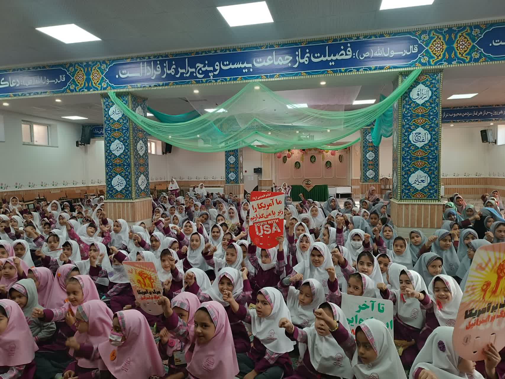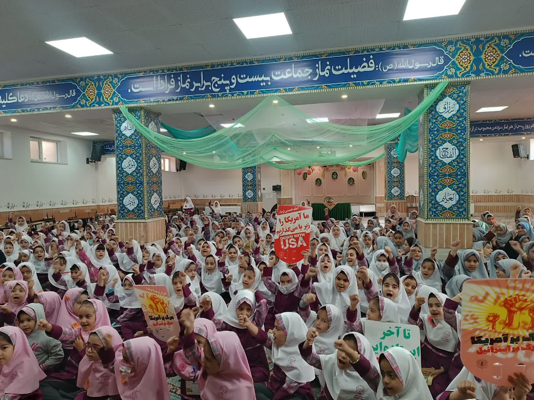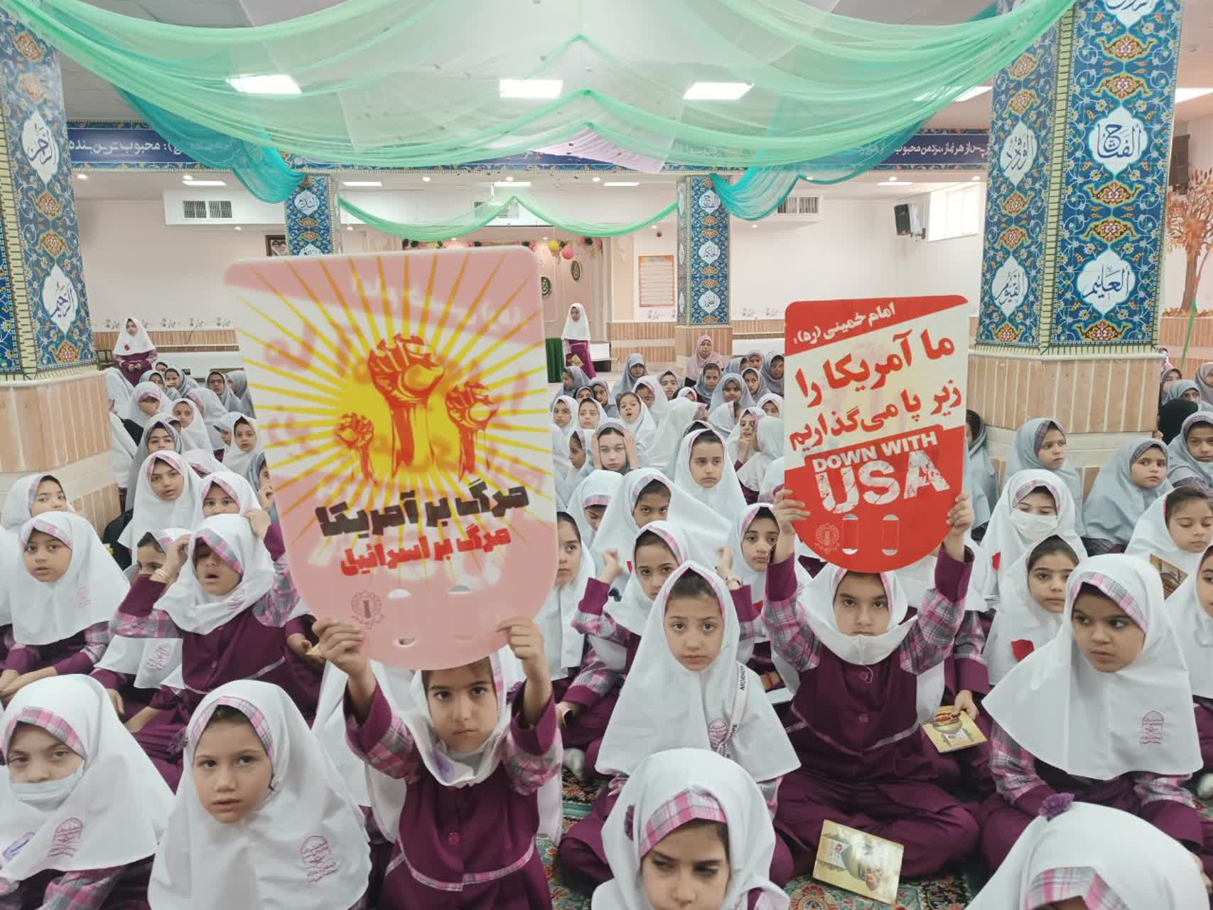 دانش آموزان دبستان دخترانه ریحانه النبی(س) در دفاع از کودکان فلسطینی وبمناسبت سالروز این حماسه عظیم در صبحگاه روز سه شنبه انزجار خود ار رژیم منحوس صهیونیسم رابا سردادن شعار اعلام نمودند.به امید پیروزی حق علیه باطل…