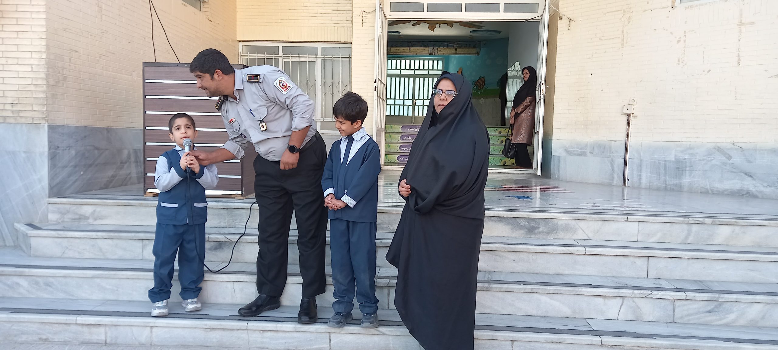 در این برنامه جناب آقای کریمی غیور مرد آتشنشان با حضور در صبحگاه ، به معرفی شغل آتشنشانی برای پایه های اول تا سوم و پیش دبستانی پرداختند و موارد ایمنی و نکته های مهم این شغل را بیان نمودند در پایان یکی از عزیزان آتشنشان با پوشیدن لباس مخصوص آتشنشانی به توضیح درباره این مورد نیز پرداختند دبستان پسرانه حضرت خاتم الانبیاء (ص) یزد