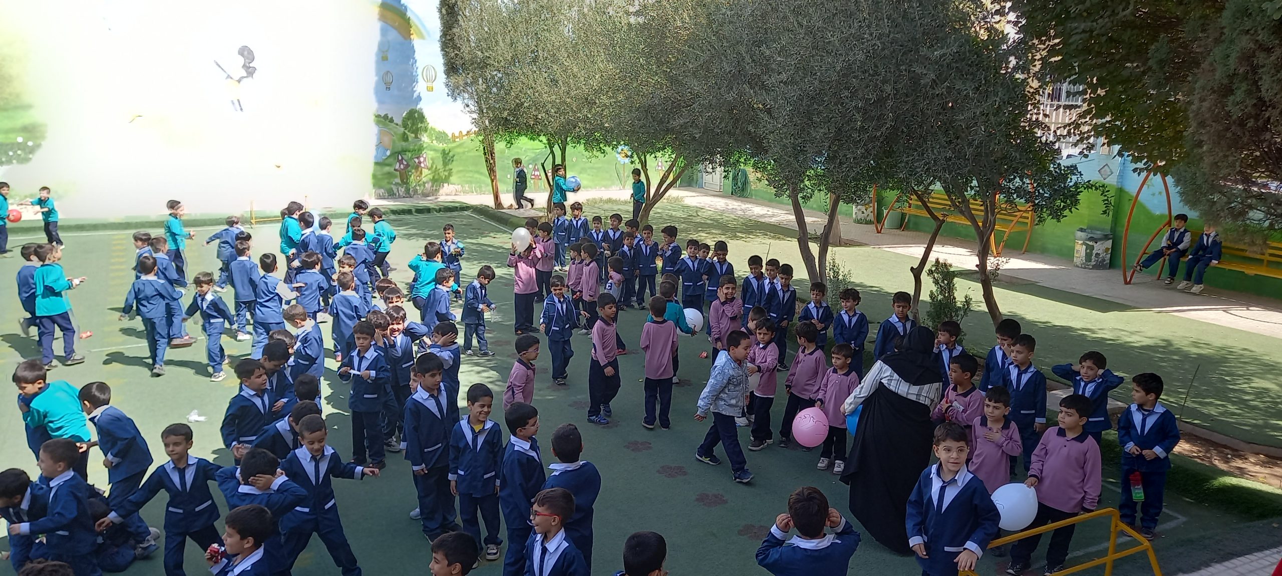 در این مراسم که با حضور معاون پایه و معاون پرورشی در حیاط مدرسه برگزار شد ،دانش آموزان دوره اول دبستان و پیش دبستانی ضمن بازی با بادکنک و شادی ، بادکنک ها را به یاد کودکان فلسطینی در حیاط مدرسه به هوا پرتاب کردند.