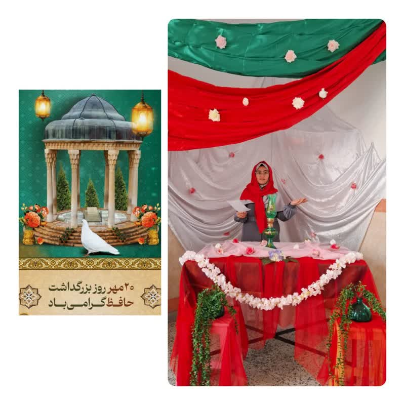 به مناسبت فرارسیدن بیستم مهرماه، روز ملی بزرگداشت لسانالغیب، خواجه شمسالدین محمد حافظ شیرازی، مراسمی فاخر و پربار در دبیرستان دخترانه دوره اول ریحانه النبی (س) برگزار گردید. این برنامه با هدف پاسداشت جایگاه رفیع این شاعر پرآوازه و ترویج فرهنگ غنی ادبیات فارسی در میان نسل نوجوان، شامل بخشهای متنوع و فرهنگی بود که به شرح زیر اجرا شد: ### تولید و پخش محتوای چندرسانهای در این روز، کادر پرورشی مدرسه اقدام به تهیه و انتشار محتوای فرهنگی-آموزشی و همچنین یک کلیپ اختصاصی نمودند. این محتوا با محوریت شرح حال زندگی، اندیشههای عرفانی و مضامین والای غزلیات حافظ، در فضای آموزشی و پرورشی مدرسه برای دانشآموزان پخش گردید تا آگاهی آنان نسبت به میراث ادبی کشور تعمیق یابد. ### اجرای هنرمندانه حافظخوانی یکی از برجستهترین قسمتهای این مراسم، اجرای دلنشین و شیوا توسط یکی از دانشآموزان مستعد دبیرستان بود. این دانشآموز، محتوایی را که با دقت از میان اشعار برجسته حافظ انتخاب و تنظیم شده بود، در قالب “حافظخوانی” اجرا کرد. این قرائت هنرمندانه که با لحنی متناسب با مفاهیم عمیق غزلهای حافظ همراه بود، مورد توجه و استقبال گرم مسئولین و دانشآموزان قرار گرفت و فضای مدرسه را سرشار از عطر کلام دلانگیز این شاعر بزرگ کرد. برگزاری چنین مراسمی در دبیرستان ریحانه النبی (س)، گامی مؤثر در جهت تقویت هویت ملی و ادبی دانشآموزان و آشنایی عملی آنان با گنجینه بیبدیل شعر فارسی به شمار میرود.