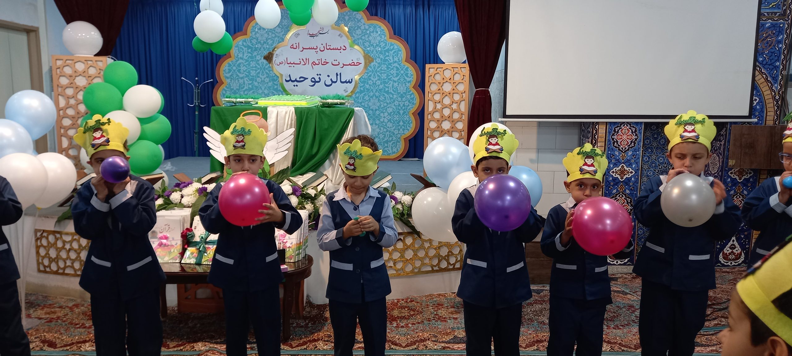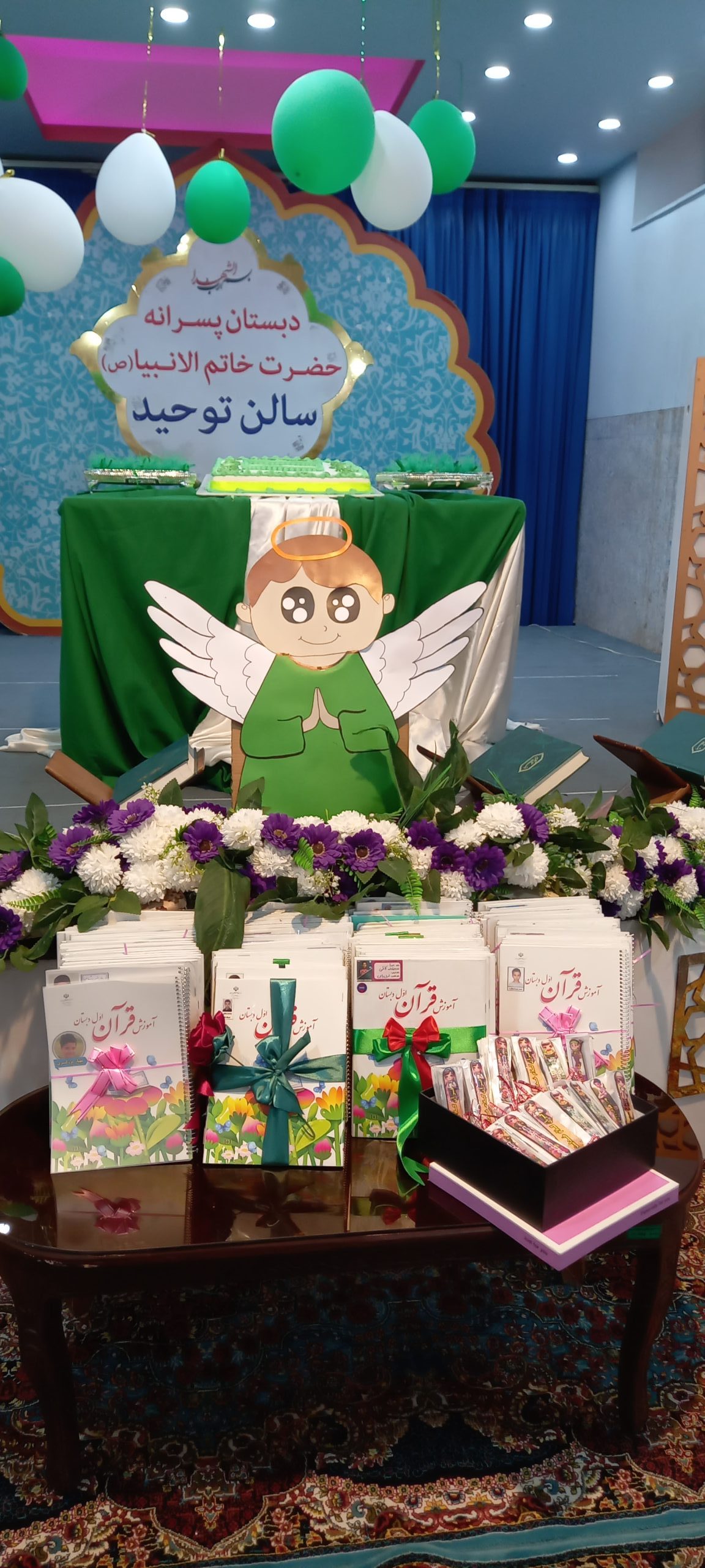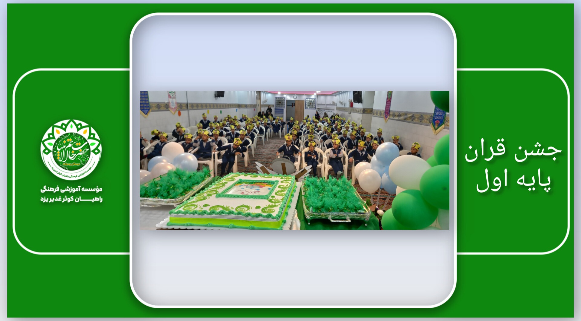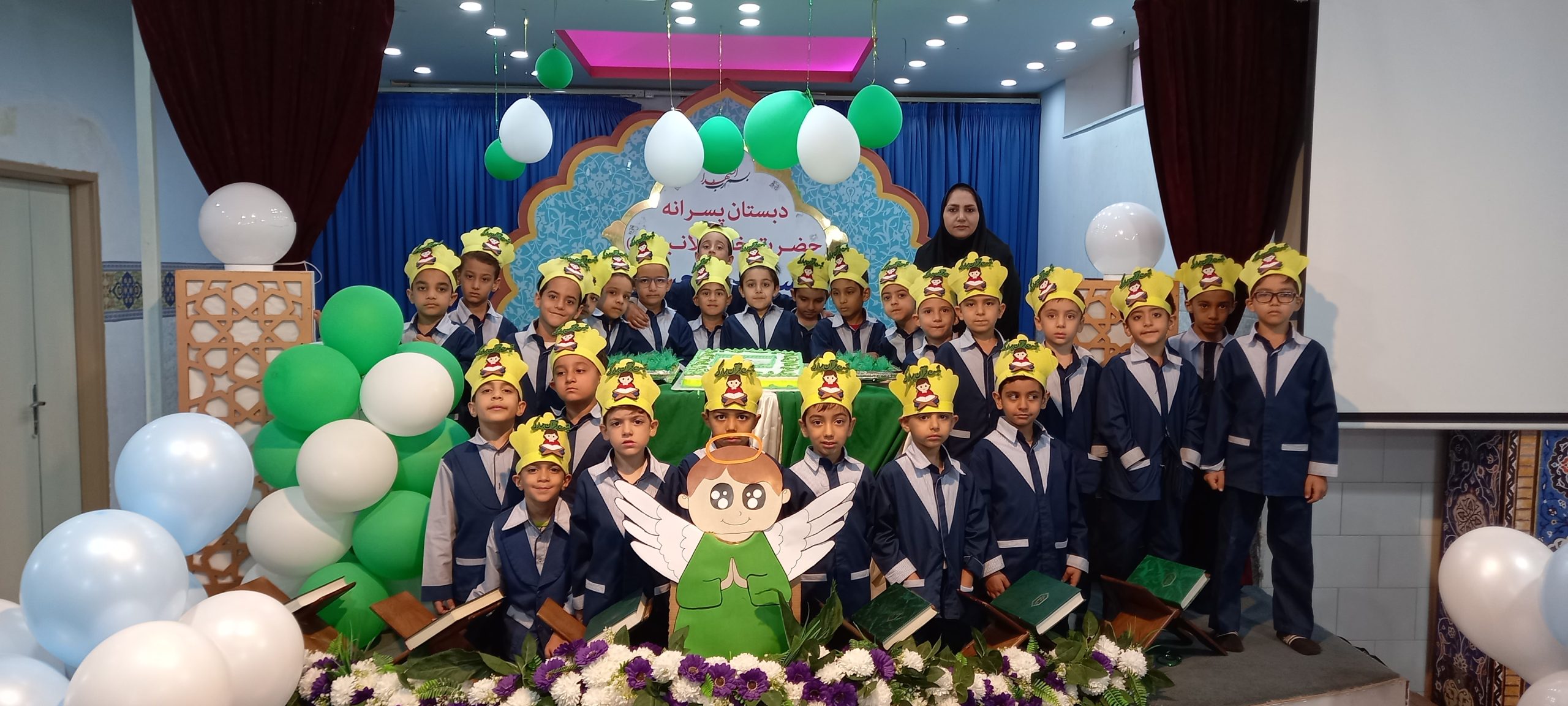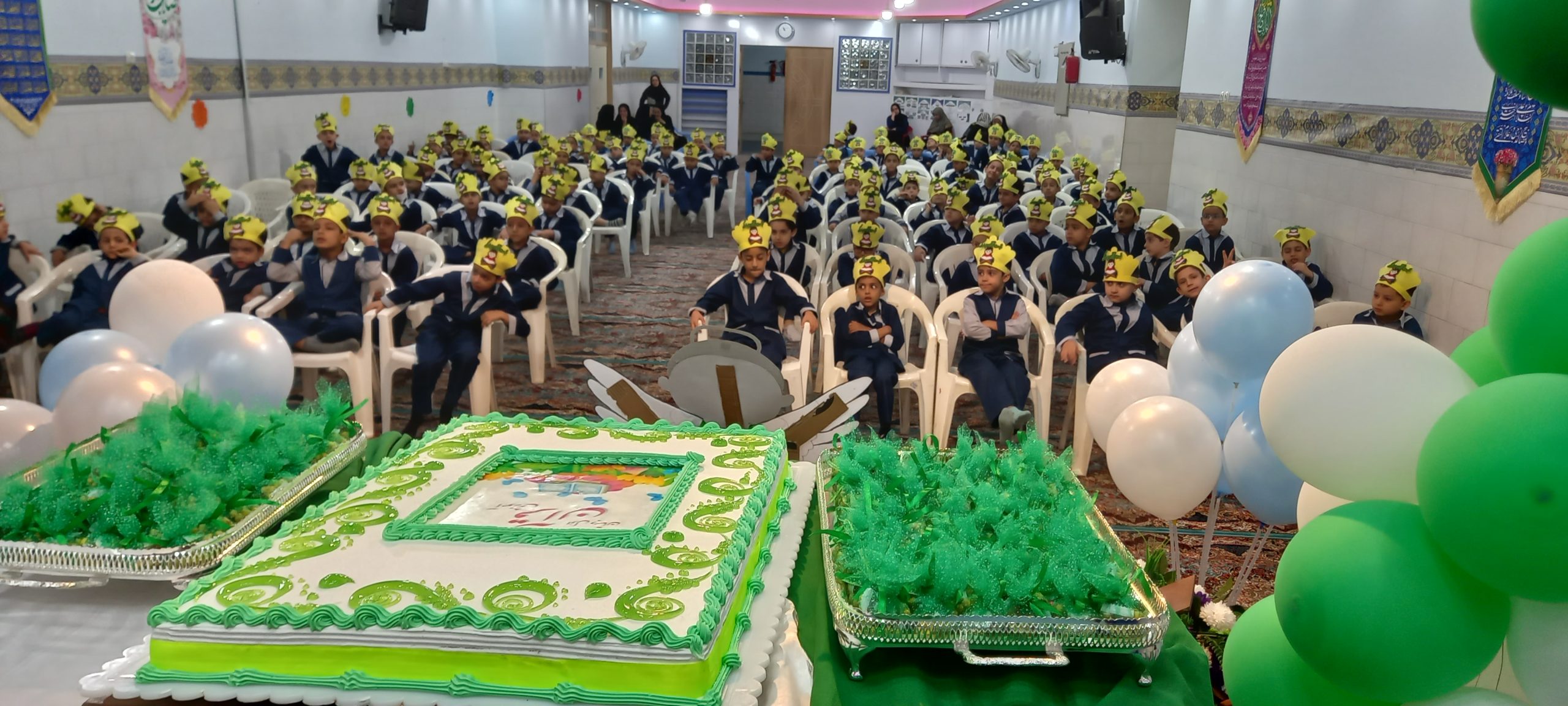 در پایان دانش اموزان ضمن گذاشتن تاج قرانی بر روی سر خود و گرفتن عکس یادگاری ،با نوش جان کردن کیک کام خود را شیرین نمودند. دبستان پسرانه حضرت خاتم الانبیاء (ص) یزد