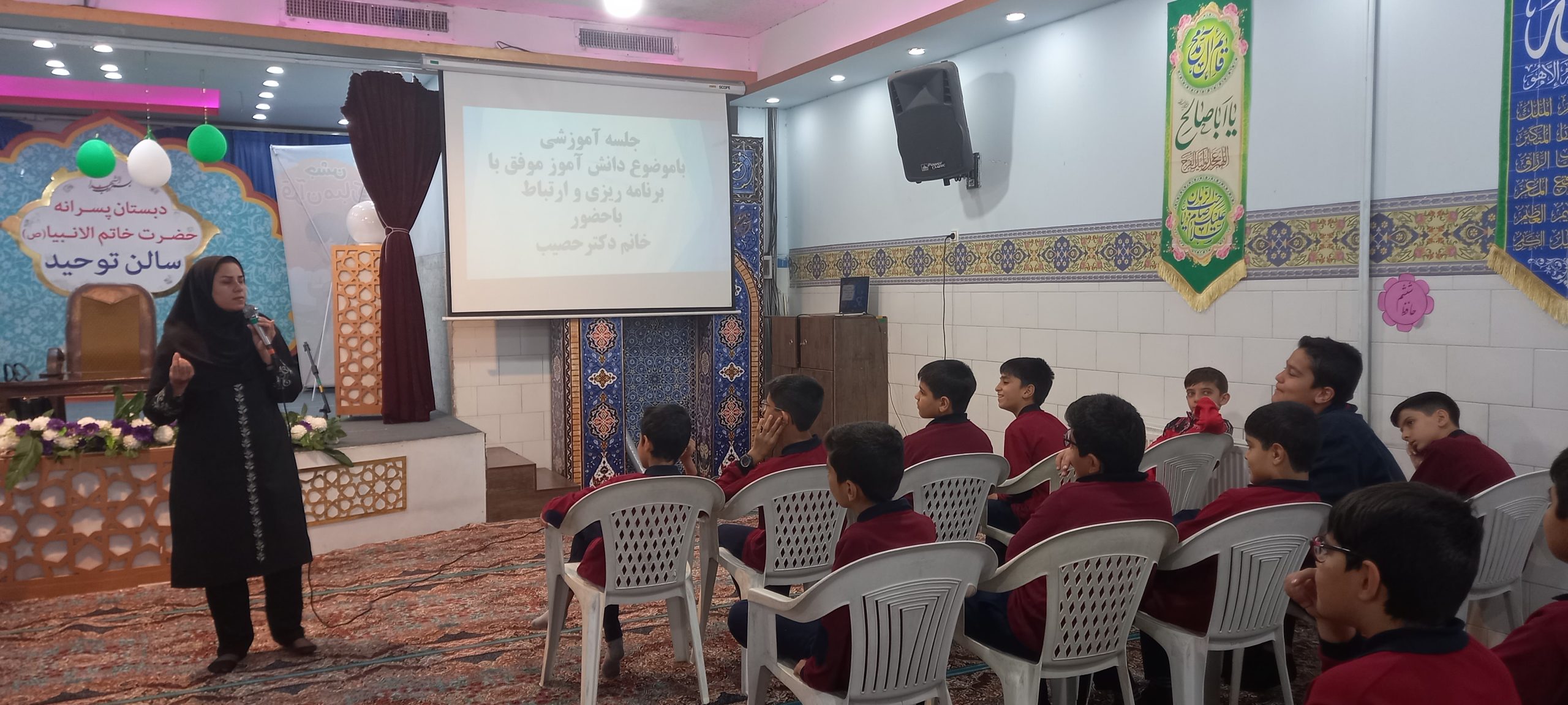 جلسه آموزشی مختص دانش آموزان پایه ششم با حضور خانم دکتر حصیب با موضوع دانش آموز موفق با برنامه ریزی و ارتباط برگزار شد.