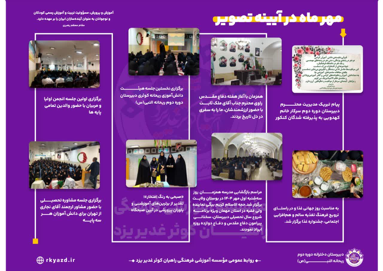 ماهنامه مهرماه دبیرستان دوره دوم ریحانه النبی س ؛روایتی خبری و تصویری از یک ماه تلاش انتشار یافت.