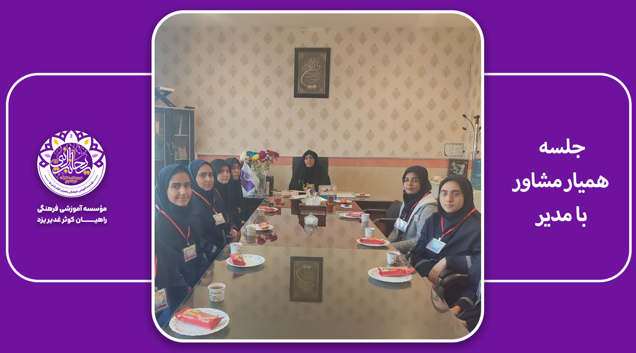 در طی هفته گذشته با حضور مشاوران مدرسه ،همیاران مشاور طی رای گیری انتخاب شد و اولین جلسه همیاران مشاور با حضور مدیر محترم ، معاون پرورشی و مشاوران هر پایه راس ساعت 11:15 دقیقه صبح روز سه شنبه تشکیل شد .