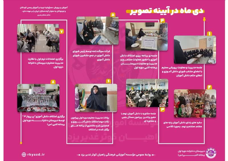 این ماهنامه، آیینهای از همت، تلاش و همدلی دبیرستان دوره اول ریحانه النبی س زیر نظر راهیان کوثر غدیر یزد می باشد.